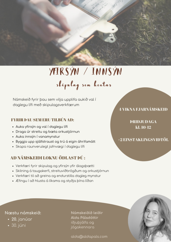 Yfirsýn / Innsýn er stutt og aðgengilegt netnámskeið fyrir fólk sem vill skapa meiri skýrleika, mýkt og flæði í daglegu lífi.