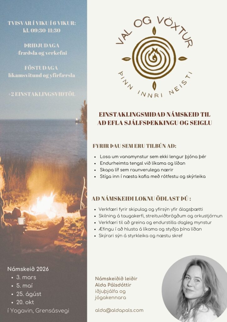 Við vinnum með líkamsvitund, ígrundun og hagnýt verkfæri til að skapa jafnvægi á milli vinnu og einkalífs – og efla getu til að taka þátt í lífi sem endurspeglar þín gildi, þína orku og þína framtíðarsýn.